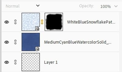 Next, I drag a different snowflake patterned paper into the file directly above the solid base. The paper I’m using today is another one I created using a watercolor background and some of the same brushes I used for last week’s snowflake edge: