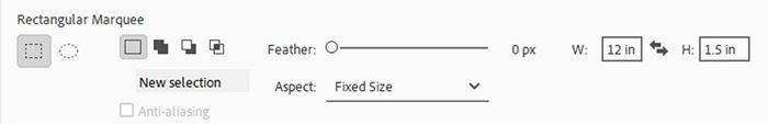 I click on the New Selection icon, set Feather to zero, the Aspect to Fixed Size, the width (W) to 12 inches and the height (H) to 1.5 inches. I click on the document somewhere near the top of the word and the selection box is displayed: