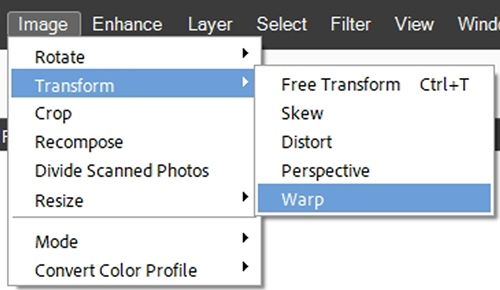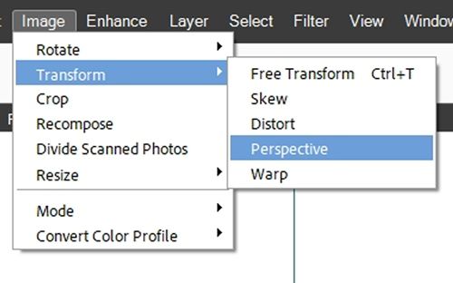 With the FOLD Top layer active in the Layers Panel, I go to the top tool bar and click Image->Transform->Perspective: