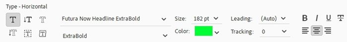 I select the Futura Now Headline Extra Bold font, set the Color to a very bright green (#14f80f), the Size to 182, the Leading to Auto and the Tracking to zero and click on the Center Text icon.