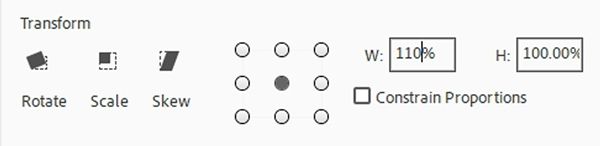 Then In the Transform tool options I again check to ensure that Constrain Proportions is unchecked, set the width (W) percentage to 110% and click the check mark to confirm: