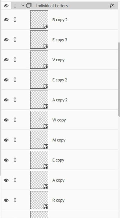 I’m going to select (activate) each of the letters’ layers & duplicate the “group”. With those duplicate letters still active I then click the Create a group icon in the Layers panel to create a group and name it Individual Letters. For now, I will hide this group and move it to the bottom (below all the other letters.)