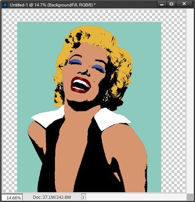 Now I create a new layer naming it “BackgroundFill”. This new layer initially appears above the SkinTone layer. I need to move this BackgroundFill layer beneath all the other layers I’ve created. With the BackgroundFill layer active I first change my foreground color chip to a suitable color for the background. I kind of like the background in the Warhol print so I’m going to go with that color (#8ccabf). I can then just use the Paint Bucket tool to fill the new BackgroundFill layer: